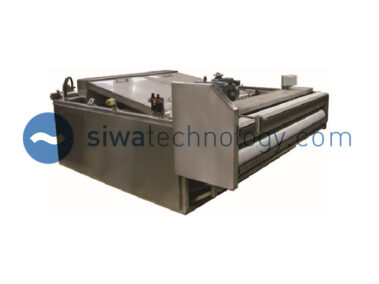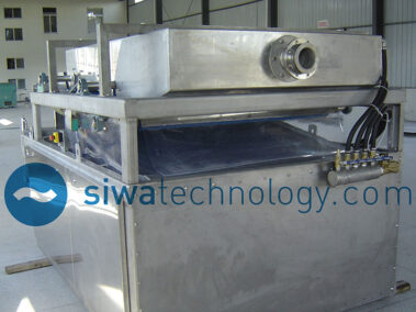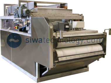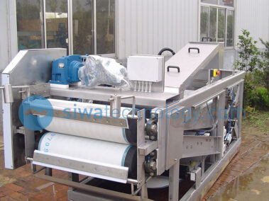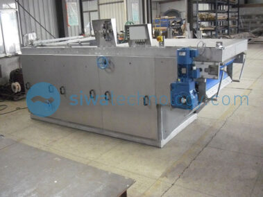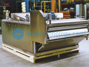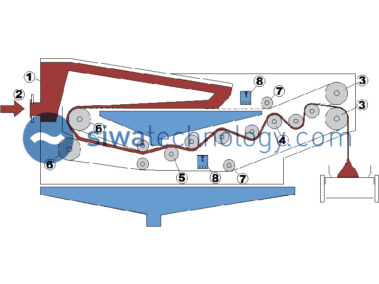 It consists of draining the sludge between two endless belts under pressure. Initially the sludge is placed on the upper band where drainage by gravity occurs. From the point where the bands meet, the mud is transported between them. The bands move between rollers that cause compression on the mud. The use of rollers of different diameters allows increasing the pressure and changing the direction of the band, exerting a shearing effect.